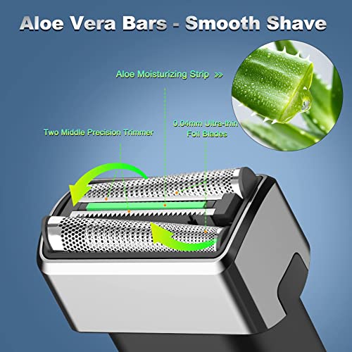 【IPX6 Waterproof-Wet & Dry】-Aloe vera strip trimming scissors in the middle,it can shave longer beards and hairs, so that the razor can give customers a better experience regardless of the length of the beard. Aloe vera strips can effectively lubricate and protect the skin when wet.This wet & dry shaver is IPX6 waterproof and can be used with foam, gel or even under the shower.