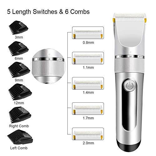 ✂Precise Length Control of Hair Trimmer: The clippers for hair cutting includes 5 precise length control(0.8/1.1/1.4/1.7/2mm) and 6 guide combs(3/6/9/12mm/left/right), which ensures the flexibility of your hairstyle.