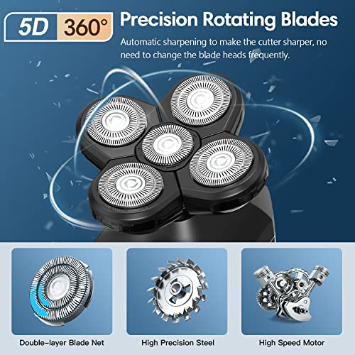 đ§ăPainless Shavingă 5D rotating shaving, high-speed powerful motor, 5 direction flexible head and precision blade upgrade double blade technology. Head Shaver for Men fully quickly and gently completes the shaving.