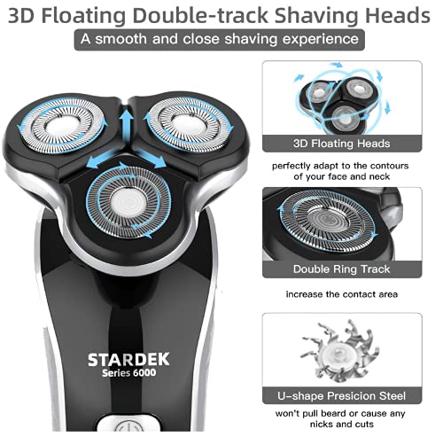 💧【3D Rotary Floating Shaver Head】 This electric shaver can perfectly fit the contours of your face, neck, and even the jaw, providing you a smooth, comfortable, close and clean shave. Its head uses high-quality titanium-plated steel blades that are self-sharpening, won’t pull your beard, or cause any nicks and cuts. The unique design of the double loop can increase the contact area by 50% to save shaving time greatly.