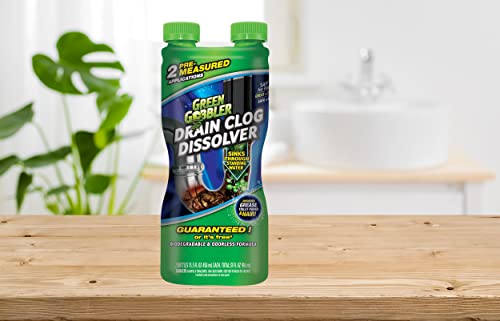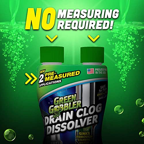 Green Gobbler Drain Clog Dissolver Gobbles the toughest clogs and pipe problems. The thick/high density formula sinks through standing water to reach your problem areas. Our environmentally friendly, biodegradable formula dissolves hair, soap, toilet paper, personal care wipes and other organic materials. Our formula does not contain bleach or sodium hydroxide and is safe for PVC, ABS, copper, and cast-iron household pipes. Our dissolver can be used in the toilet as well and is safe for septic systems. The dual chamber bottle contains 2 applications that are pre-measured, making it easy to use with no measuring required! Our formula is odorless, and fume-free. Green Gobbler stands behind our product and offers a 30-day Money Back Guarantee! If you aren’t completely happy with your results, contact our customer service team for a hassle-free refund.