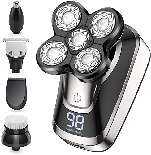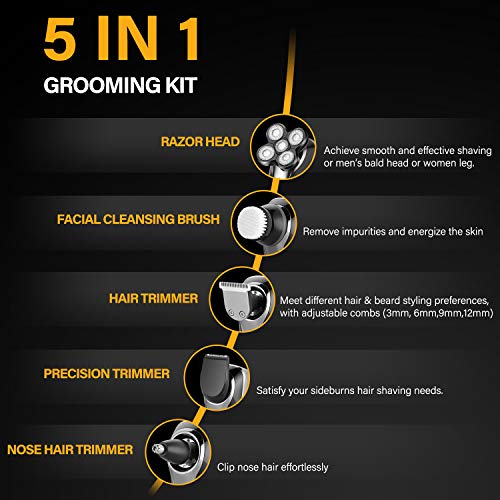 【5-IN-1 Electric Shaver Grooming Kit Sets for Men】- The multifunctional groomer sets include 5 detachable heads and 4 limit combs. The shaver head fits for men’s bald head or woman legs. The hair clipper with limit combs (3mm, 6mm, 9mm, 12mm) is suitable for different hair & beard styling needs. The sideburns clipper is for sideburns removal. Also facial cleansing brush and nose & ear hair trimmer. All-in-one kit is perfect for your needs.
