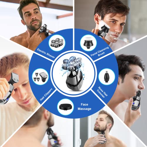 ➤【5-in-1Head Shavers for Men 】: Modern design professional electric razor for men includes 5 detachable accessories, nose/ear hair trimmer, a rotary shaving head, a hair clipper (with 3mm/5mm/7mm guide comb trimmer), plush facial cleaning brush, silica cleaning brush. Meet your different requests for hair shaving, without irritation, electric shavers for men bald head which can help us meet all our daily needs.