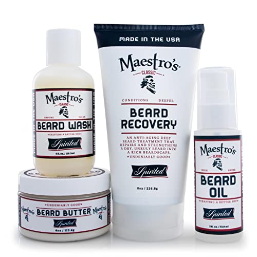 Full Blend Set includes 4oz Beard Wash, 4oz Beard Butter, 8oz Beard Recovery, & 2oz Beard Oil. Maestro’s Classic Spirited Blend Beard Wash is sulfate-free with skin conditioning agents to clean your beard and the skin on your chin. The Spirited Blend Beard Wash contains a foaming action which was added to upgrade its performance and bring you back to a time when cleaning was fun. It’s the First Step in Crafting a Better You with Beard Care Products. This product is vegan friendly, cruelty-free, and is formulated without the use of parabens. Maestro’s Classic Spirited Blend Beard Butter is a water soluble hydrating creme, rather than oil based, and succeeds in bringing moisture to the skin on your face and the hair on your chin. This Undeniably Good hydrating cream “Lays it Down” every time. It’s the Second Step in Crafting a Better You with Beard Care Products. This product is cruelty-free and is formulated without the use of parabens. Maestro’s Classic Spirited Blend Beard Recovery is a deep conditioning beard treatment product designed to be used once a week after cleaning with our Beard Wash. Our special anti-aging formula helps protect against premature aging and graying of your facial hair, and leaves it less susceptible to environmental and mechanical stress. We especially recommend using it after every beard trim for the feel of a clean, deeply conditioned beard. This product is cruelty-free and is formulated without the use of parabens. Maestro’s Classic Spirited Blend Beard Oil is our answer for the high shine style when Crafting a Better You in Beard Care. Get the all day high shine style and control your beard deserves. This product is vegan friendly, cruelty-free, and is formulated without the use of parabens.